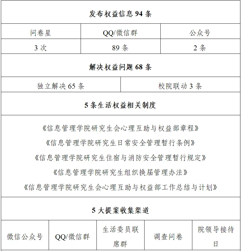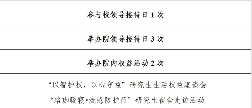 扎实权益维护。完善“五大渠道,校院联动”问题反馈机制,积极通过公众号、年级群、班长联席群、生活权益线上调查问卷、院领导接待日5个渠道发布权益信息,与校研会保持密切沟通。征集研代会提案并商讨解决方案;提交校领导接待日提案,积极沟通解决方案;收集权益问题并及时解决。举办“研究生宿舍走访”“权益知识竞赛沙龙”等权益活动。