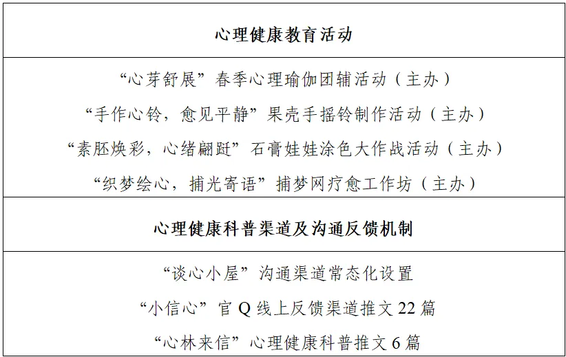 强化心理健康教育,筑牢心理健康防线。通过线下“谈心小屋”和线上“小信心”QQ、“心事树洞”,提供多样化的心理疏导渠道,发布沟通渠道推文22篇,心理健康科普推文6篇。开展心灵瑜伽等心理健康教育活动4场。