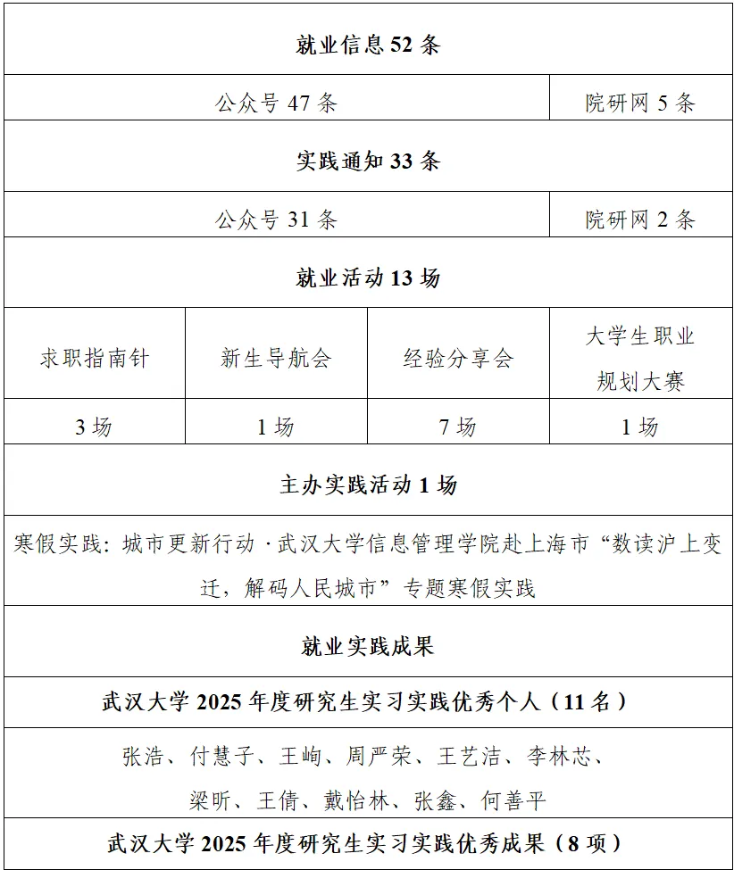 赋能就业实践发展。资讯发布高效精准,通过公众号、院研网发布就业信息52条、实践通知33条。开展12场就业主题活动,覆盖求职技巧、职业规划全链条指导;主办1场实践活动,以实地调研提升实践能力。实践成果丰硕,多名同学获评实习实践优秀个人,多项成果斩获校级优秀奖项及专项赛事各级荣誉。