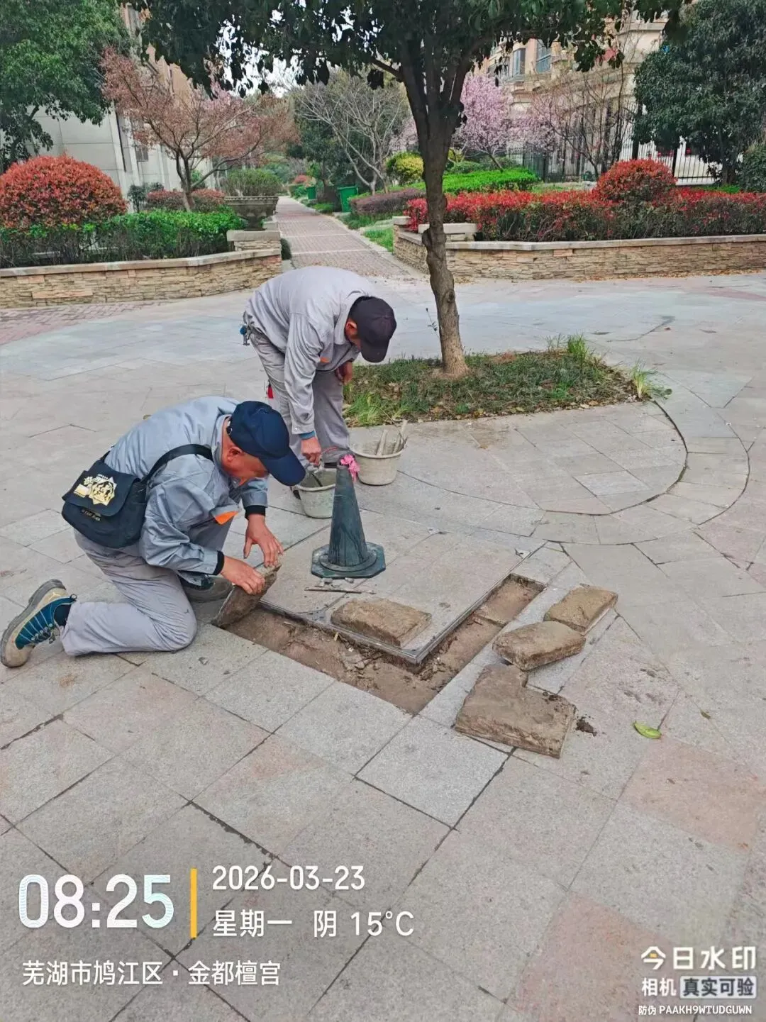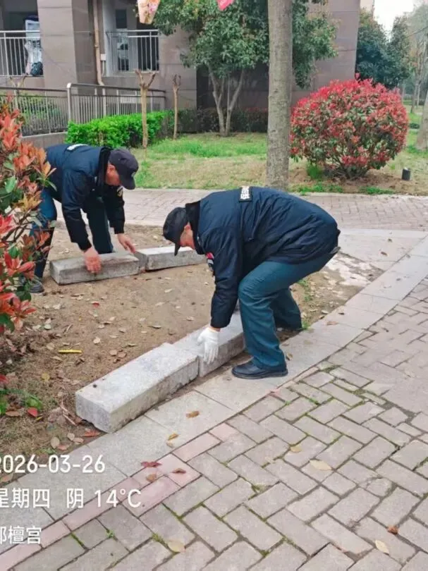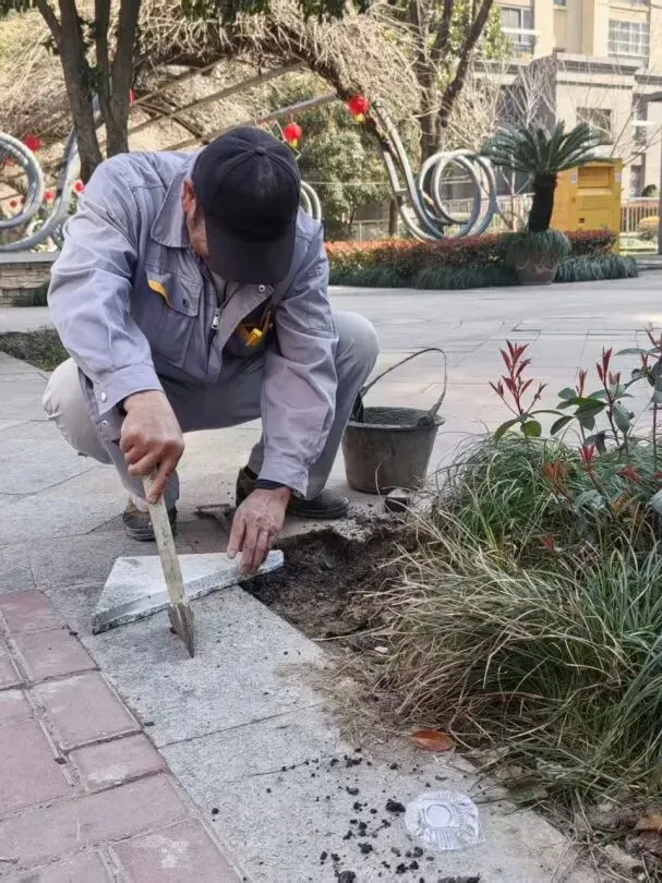 4、园区中心道路松动的大理石砖块加固维修;
