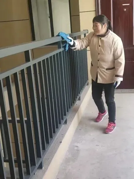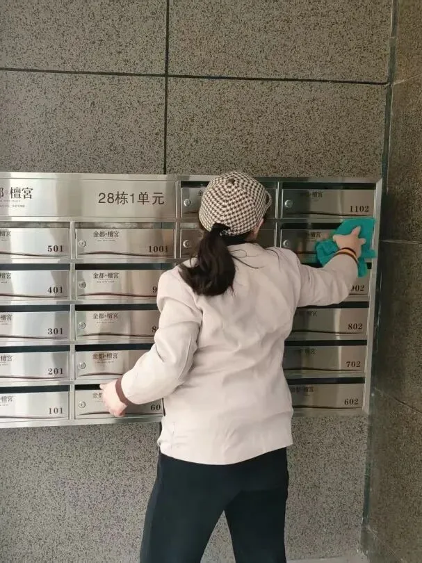 9、单元门玻璃门窗、标识牌、消防器材等擦拭;