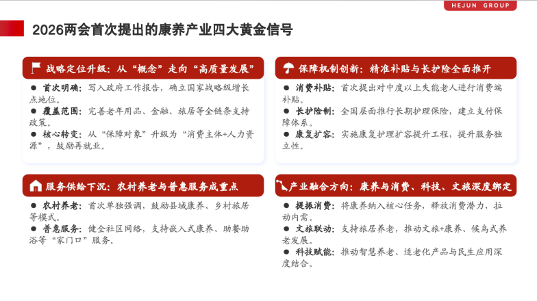 2026年全国两会与政府工作报告,是银发产业发展进程中具有标志性意义的节点,报告首次集中释放出康养产业四大黄金信号,标志着银发产业进入全新发展阶段,也为市场传递出最明确、最有力的政策导向。