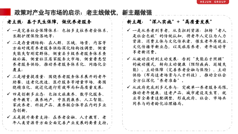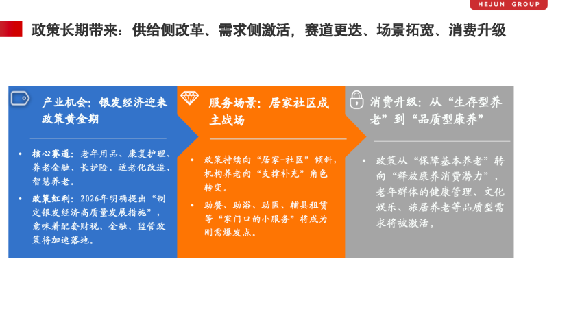 从政策层面看,养老政策逻辑完成历史性跃迁,从聚焦民生保障转向推动产业高质量发展,供给侧改革与需求侧激活同步推进,带来赛道更迭、场景拓宽、消费升级的多重机遇。