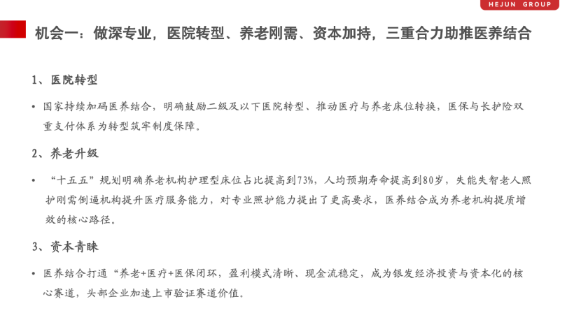 第一个战略机会是做深专业能力,牢牢把握医养结合发展大趋势。当前,医院转型、养老刚需升级、资本加持三重合力,共同推动医养结合成为银发经济的核心赛道。从政策导向来看,国家持续加码医养结合,明确鼓励二级及以下医院向康养机构转型,推动医疗床位与养老床位合理转换,医保与长期护理保险双重支付体系,为医院转型提供了坚实的制度保障。
