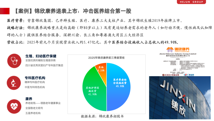 近期备受行业关注的锦欣康养递表港交所,正是医养结合赛道资本化的标志性事件,有望成为内地医养结合第一股。锦欣康养背靠锦欣集团,依托集团在医疗领域的深厚积淀,聚焦80岁以上高龄及失能、认知障碍等刚需老人,深耕川渝、长三角、粤港澳大湾区三大核心区域,构建起完善的医养结合服务网络。招股书数据显示,2025年前九个月锦欣康养实现营业收入约5.47亿元,其中医养结合设施收入占比接近五成,清晰印证了医养结合模式的盈利能力与市场认可度,也为行业资本化发展树立了标杆。