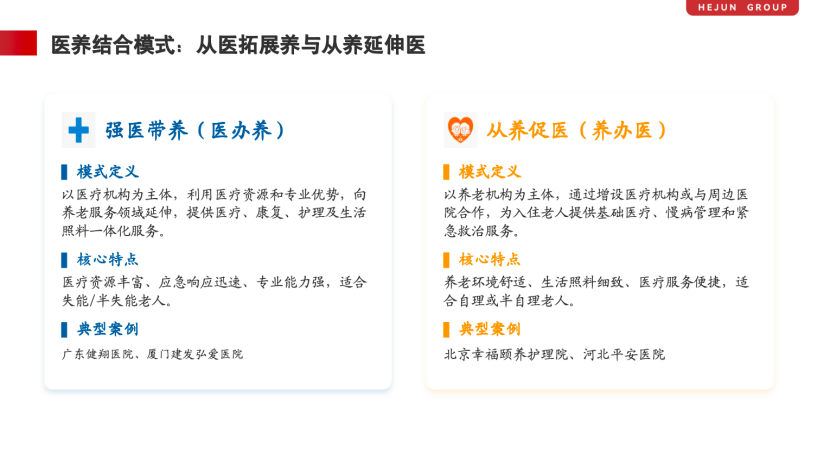 医养结合主要有两种成熟模式,一种是强医带养的医办养模式,以医疗机构为主体,依托医疗资源与专业优势,向养老服务领域延伸,提供医疗、康复、护理、生活照料一体化服务,医疗资源丰富、应急响应快、专业能力强,更适合失能、半失能老人;另一种是从养促医的养办医模式,以养老机构为主体,通过增设医疗机构或与周边医院合作,为入住老人提供基础医疗、慢病管理、紧急救治等服务,养老环境舒适、生活照料细致,更适合自理或半自理老人,企业可根据自身资源禀赋选择适配的发展模式。