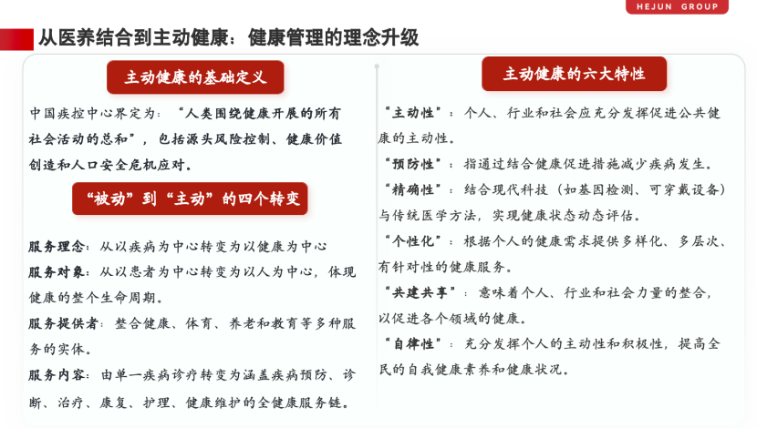 同时,医养结合正逐步向主动健康理念升级,从以疾病为中心转向以健康为中心,服务对象覆盖全生命周期,服务内容涵盖预防、诊断、治疗、康复、护理、健康维护的全链条,主动健康的主动性、预防性、精确性、个性化、共建共享、自律性六大特性,将成为未来医养健康服务的核心方向。