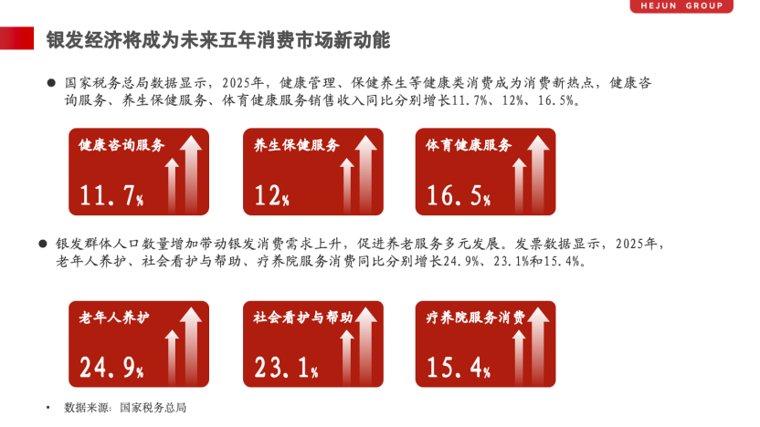从市场数据来看,银发经济已经成为消费市场的新动能,2025年国家税务总局发票数据显示,健康咨询服务、养生保健服务、体育健康服务销售收入同比分别增长11.7%、12%、16.5%,老年人养护、社会看护与帮助、疗养院服务消费同比分别增长24.9%、23.1%、15.4%,银发消费增长态势强劲。