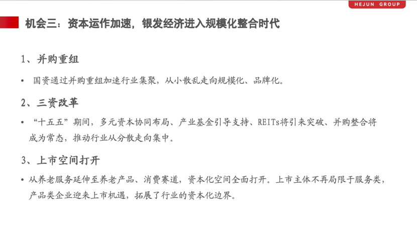 一是并购重组加速,国资通过并购重组的方式,推动行业资源集聚,引领行业从分散走向集中;二是三资改革深化,多元资本协同布局、产业基金引导支持、养老REITs实现突破,并购整合成为行业常态,推动行业整体升级;三是上市空间全面打开,银发企业的资本化边界不断拓展,上市主体不再局限于传统养老服务类企业,养老产品、银发消费类企业迎来上市机遇,资本化路径更加多元。
