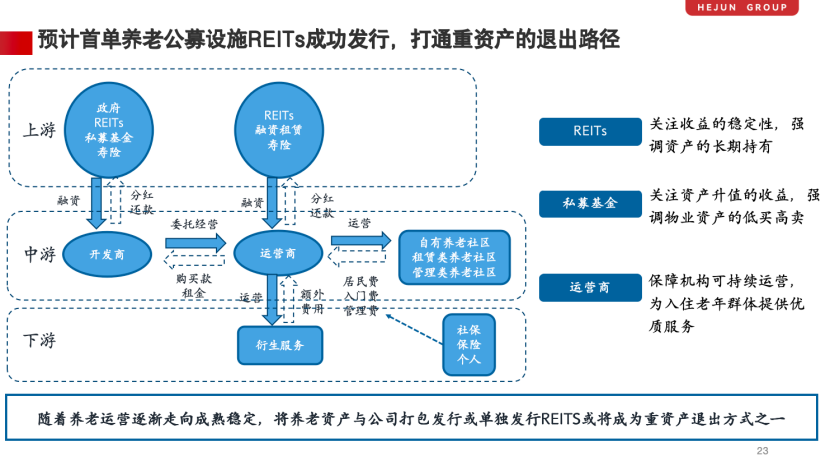 从资本运作模式来看,轻重资产分离成为未来行业发展趋势,企业兼顾产业经营与资产经营,轻资产聚焦机构养老、社区养老、居家养老、医养服务等产业运营,核心能力是精细化服务与产品输出能力,盈利点来自项目经营利润;重资产聚焦物业、土地、房屋等资产持有,核心能力是低成本资产获取与选址能力,盈利点来自资产持有价值。同时,养老公募设施REITs有望实现首单发行,打通重资产的退出路径,为行业重资产模式提供长效资本支持。