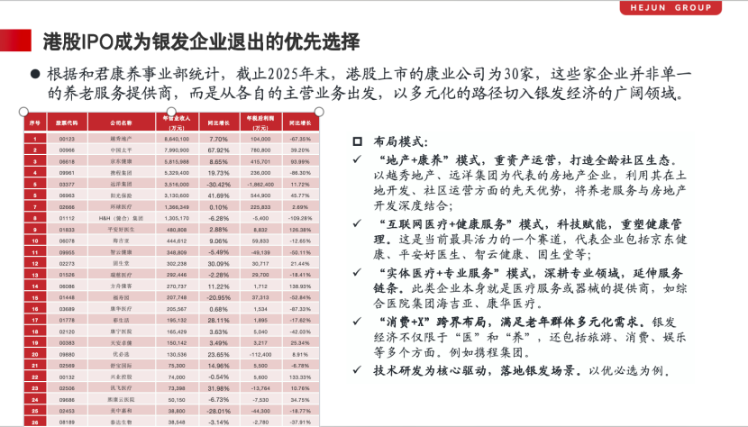 从资本市场布局来看,港股已经成为银发企业退出的优先选择,截至2025年末,港股上市康养企业达到30家,形成了“地产+康养”“互联网医疗+健康服务”“实体医疗+专业服务”“消费+X跨界布局”“技术研发驱动”等多元化布局模式,为企业资本化运作提供了丰富参考。