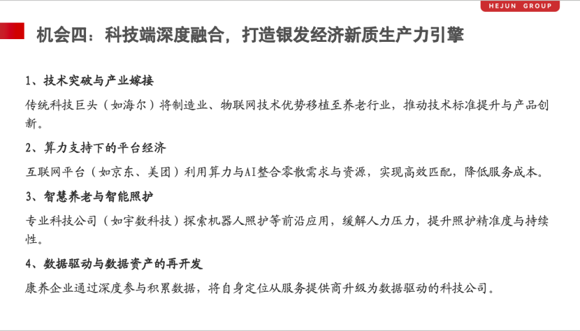 第四个战略机会是做强科技创新,打造银发经济新质生产力引擎。科技是推动银发产业提质升级、培育新质生产力的核心动力,科技与银发产业的深度融合,将重构产业发展逻辑。
