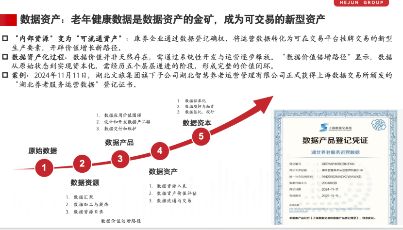 2024年11月11日,湖北文旅集团旗下该子公司正式获得上海数据交易所颁发的“湖北养老服务运营数据”登记证书,成为国内较早实现养老服务运营数据公开登记的市场主体。这一举措标志着养老数据正式完成合规确权与产品化登记,真正具备了进场交易、价值量化、产业赋能的基础条件,也为全国康养行业推进数据资产化、激活数据要素价值树立了可复制、可推广的典型样本。