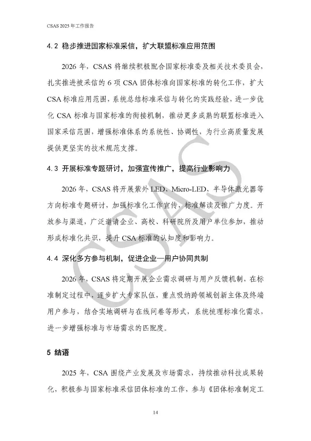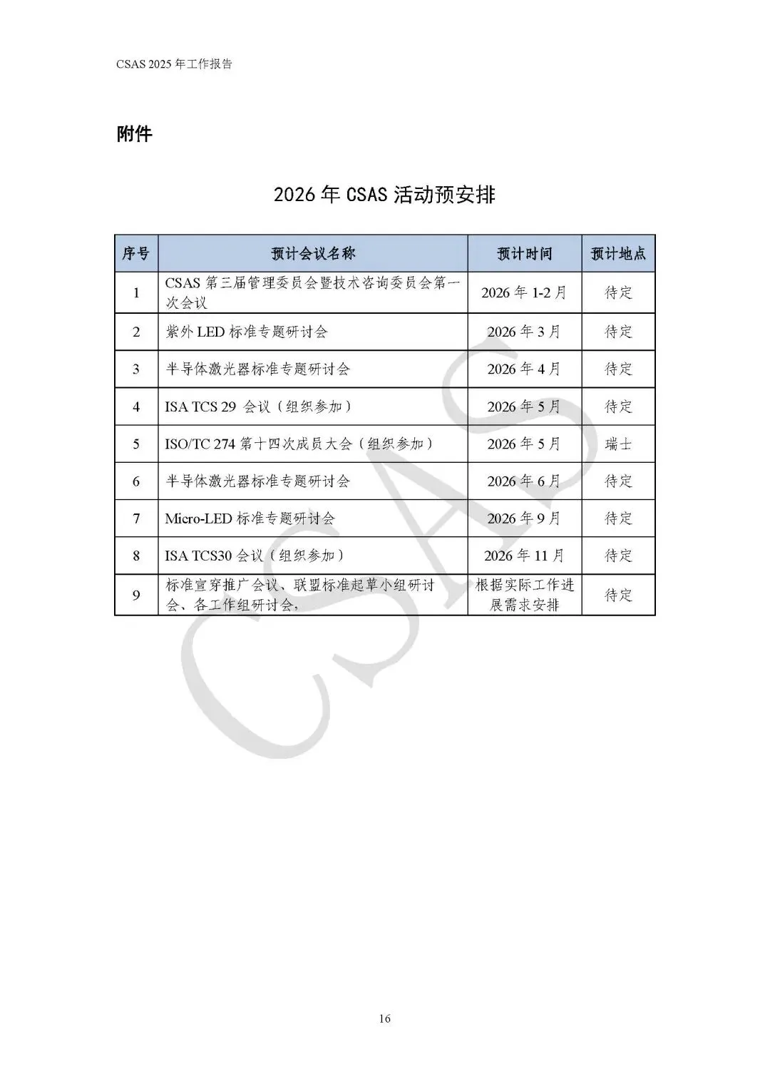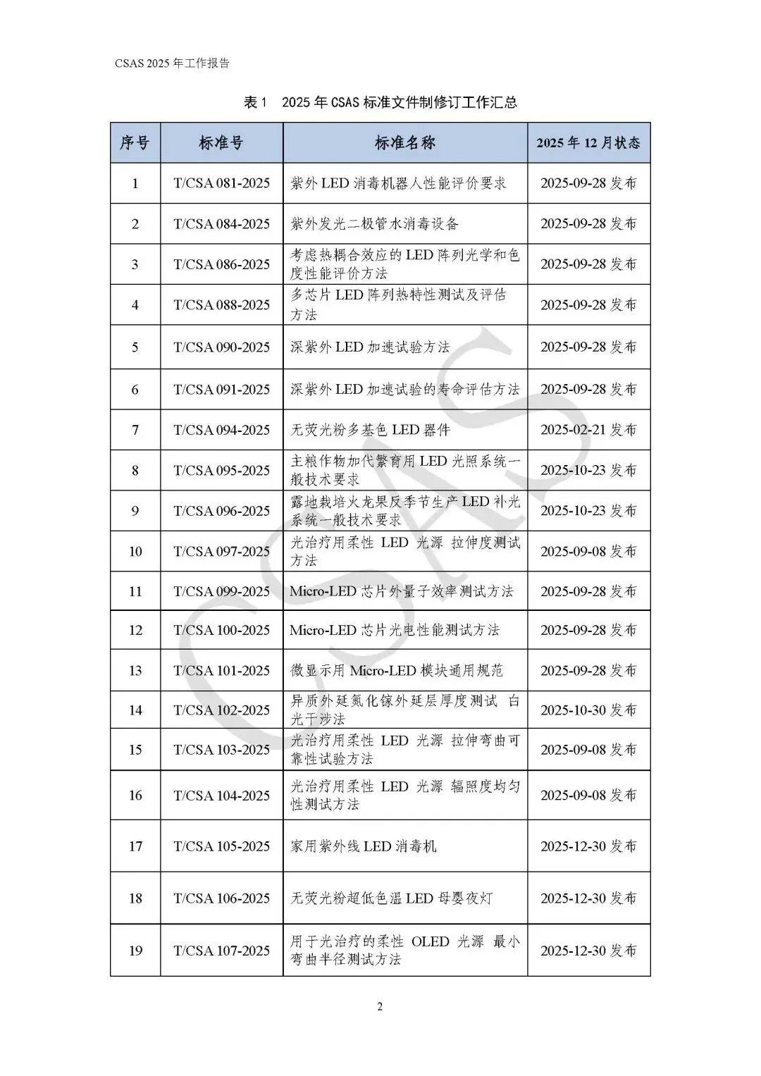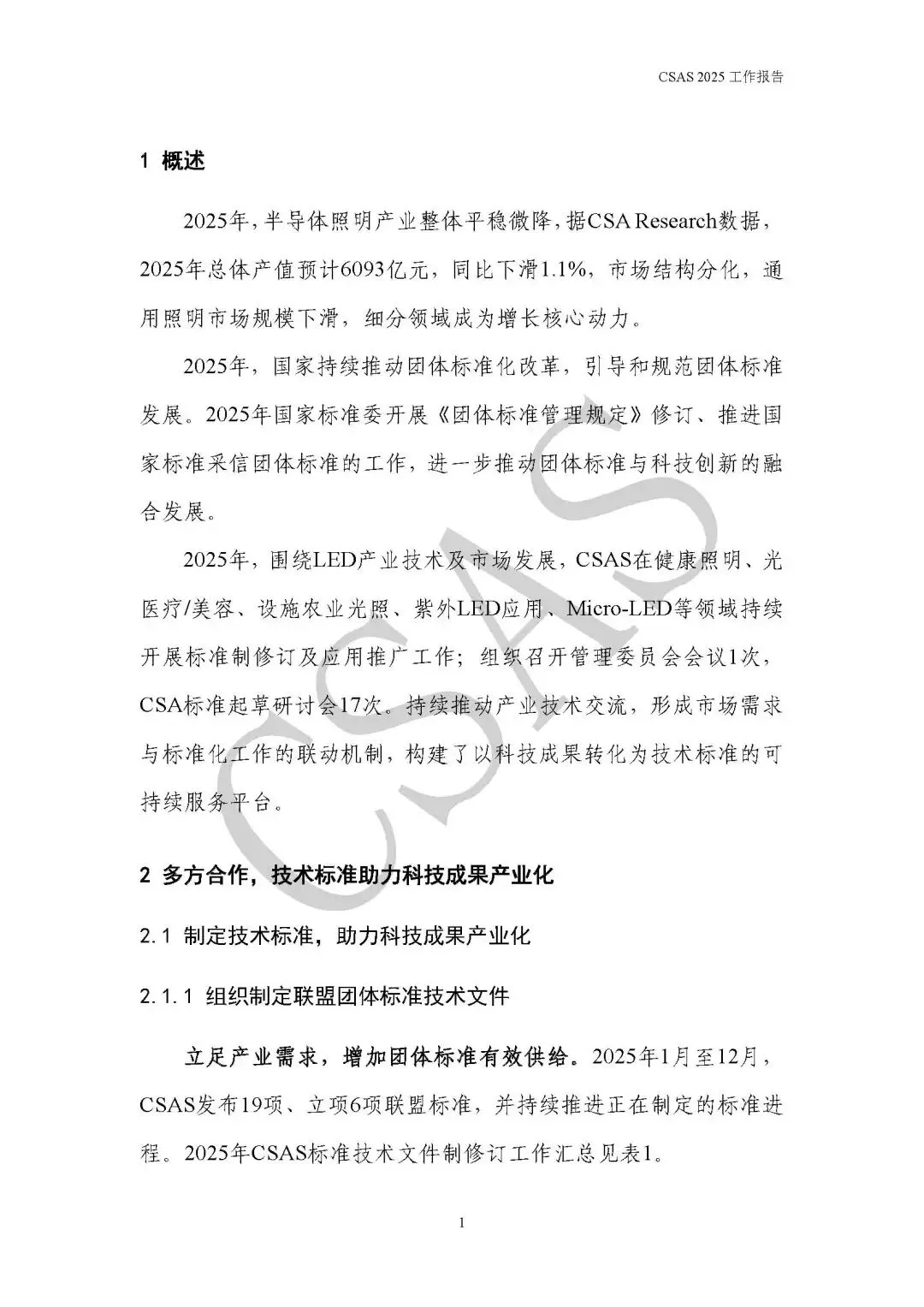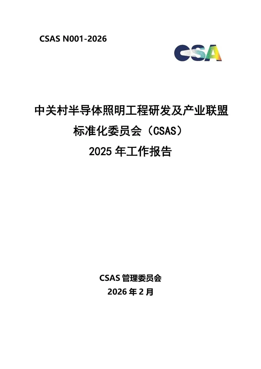 中关村半导体照明工程研发及产业联盟 标准化委员会(CSAS)发布2025年工作报告。报告全面总结了一年来联盟在团体标准、国家标准、国际标准等方面的工作进展及成果,并明确2026年深化标准化工作的重点方向。
