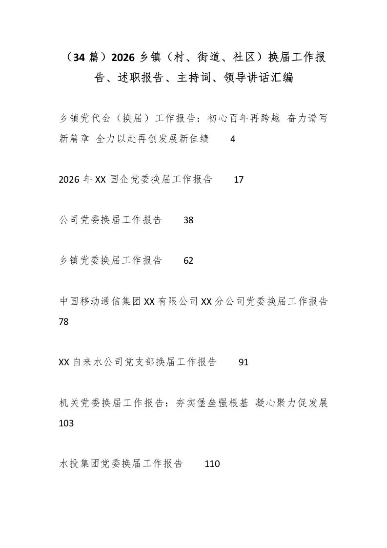 >2026乡镇(村、街道、社区)换届工作报告、述职报告、主持词、领导讲话汇编