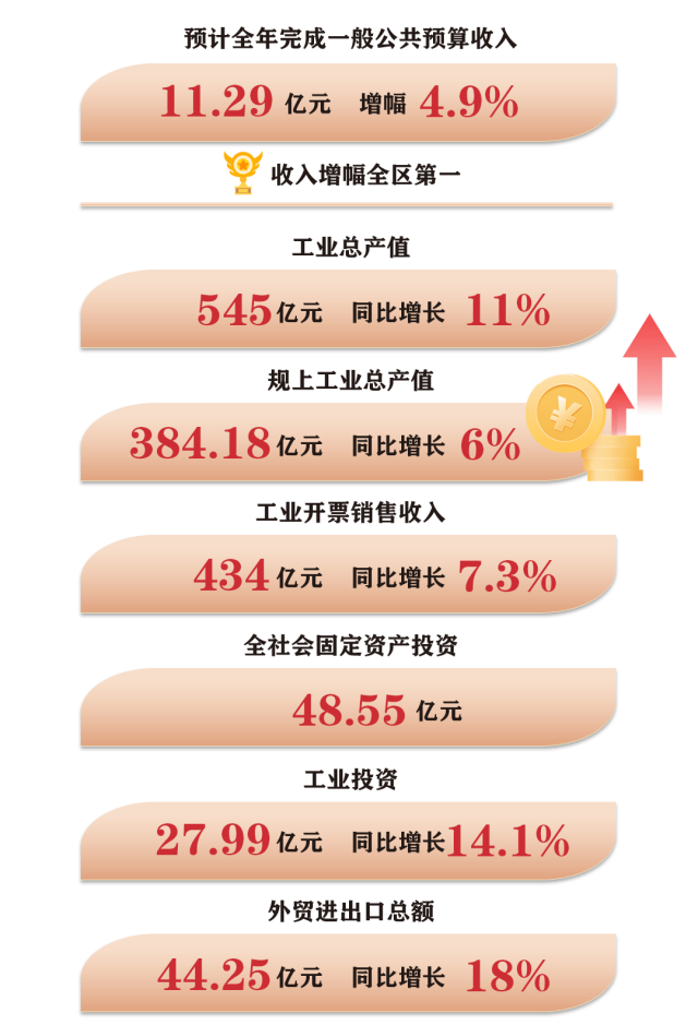 今年全镇经济社会发展主要预期目标是:地区生产总值同比增长5%;一般公共预算收入保持正增长;工业总产值增长10%,迈上600亿元台阶,其中规上工业总产值达400亿元以上;工业开票销售收入增长6%;全社会固定资产投资增长5%,其中工业投资增长15%;外贸进出口、实际使用外资量稳质升,限上批发销售额突破1000亿元;居民人均可支配收入与经济增长基本同步;单位地区生产总值能耗下降、主要污染物排放总量削减完成上级下达目标,安全生产事故起数和死亡人数稳步下降。