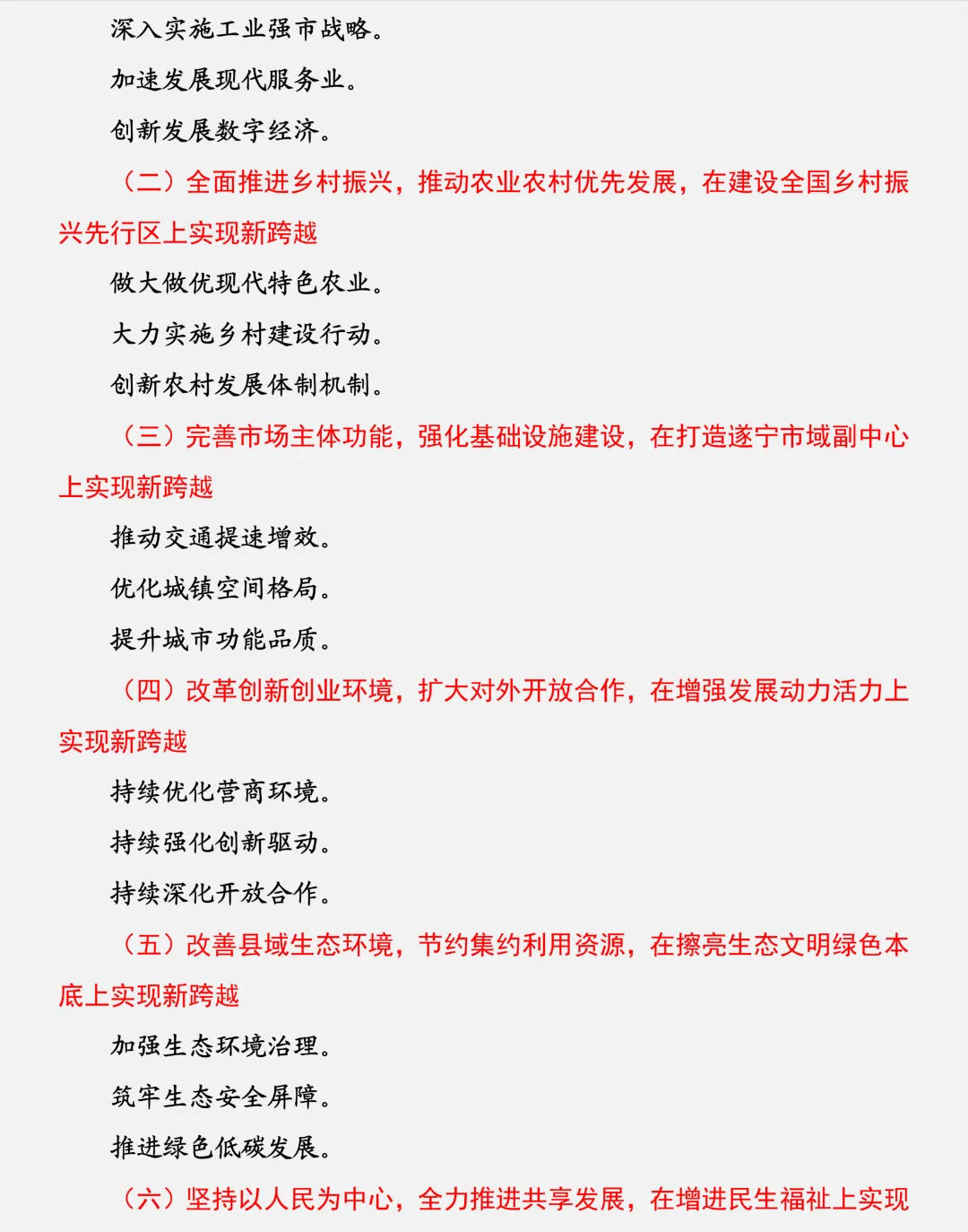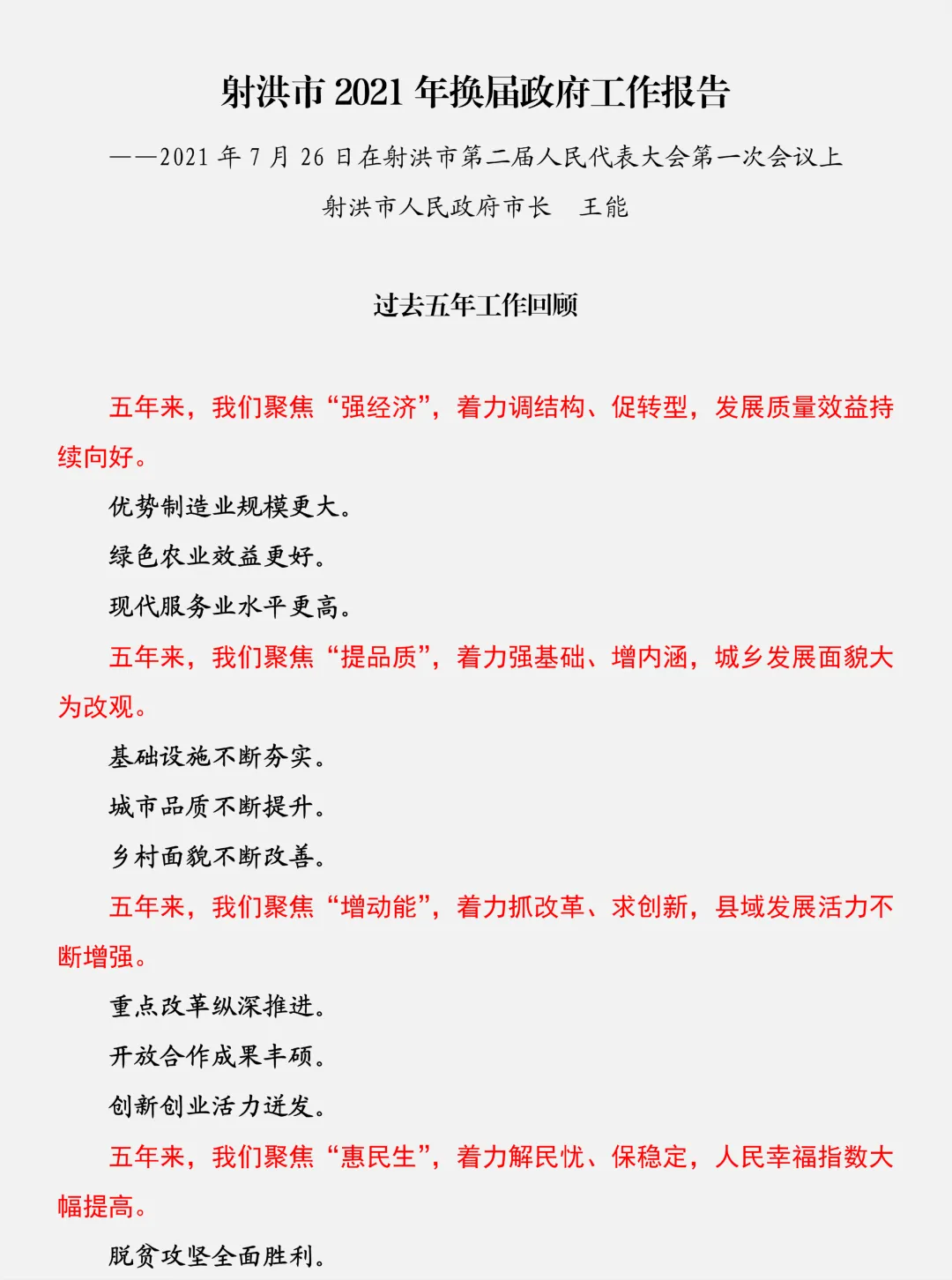 这段时间,很多朋友跟我说,看能不能多发现一些政府换届的工作报告。鉴于此,我大抵知道很多地方已经开始着手起草政府五年换届工作报告了,依照2021年的情形,大致会会在7月份左右。于是,我受大家的托付,阅读了一些地方2021年换届政府工作报告,发现了很多的好作品,但是在给大家推荐的时候,得综合考虑它的代表性,一方面是框架的普遍性,一方面是文稿的美感,因为综合水准是不好比较的,每一篇都是各地笔杆子的集大成之作,都是很高的水准的。所以,今天跟大家推荐的是一篇省辖县级市的,即射洪市《2021年换届政府工作报告》,文稿总字数达12846字,是一篇篇幅还较为精简的报告,排版下来23页的样子。从框架来看,总体分为三个大的板块,即过去五年工作回顾、今后五年工作安排、政府自身建设,总结部分分为六个部分的总结,以及“五个必须”的政府工作体会,部署部分、自身建设部分分别分为六个、四个部分,这就是整体的框架,也有的地方分为四个板块,这个后续会给大家推荐。从标题来看,总结部分的六个标题采用“五年来,我们聚焦……,着力…、…,……”的结构,内容上分别从强经济、提品质、增动能、惠民生、美环境、优服务等方面归纳盘点。部署部分的六个标题采用“……,……,在……上实现新跨越”,从产业、乡村振兴、城镇城市、开放创新、生态、民生等方面展开。自身建设部分是“四个建设”。总的来说,这篇政府五年换届工作报告,系统回顾了过去五年的工作,又系统部署了未来五年的工作,大家可以学习借鉴的是框架结构、标题语言,以及内容的组合排列,也就是总结什么、部署什么这两个终极问题。