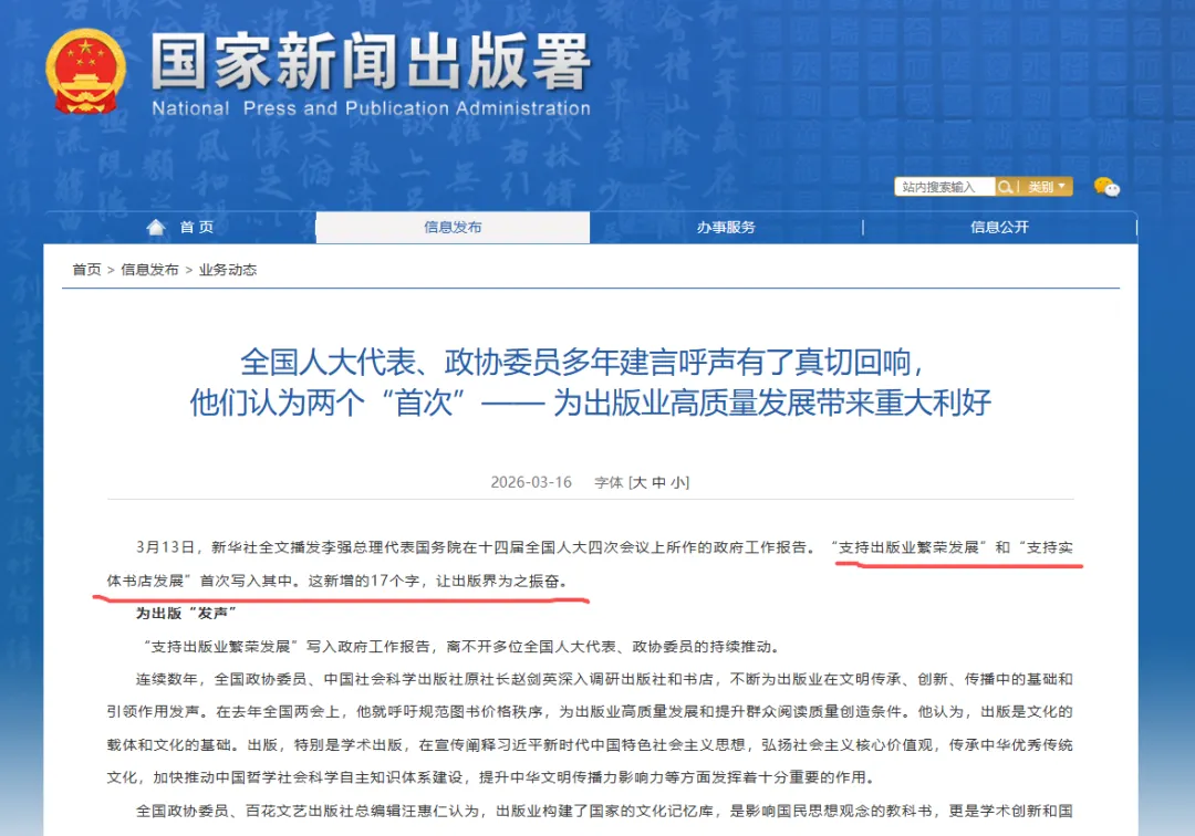 2026年3月,十四届全国人大四次会议表决通过政府工作报告决议,一项历史性的变化在出版发行业引起了巨大反响——“支持出版业繁荣发展”“支持实体书店发展”首次写入政府工作报告。