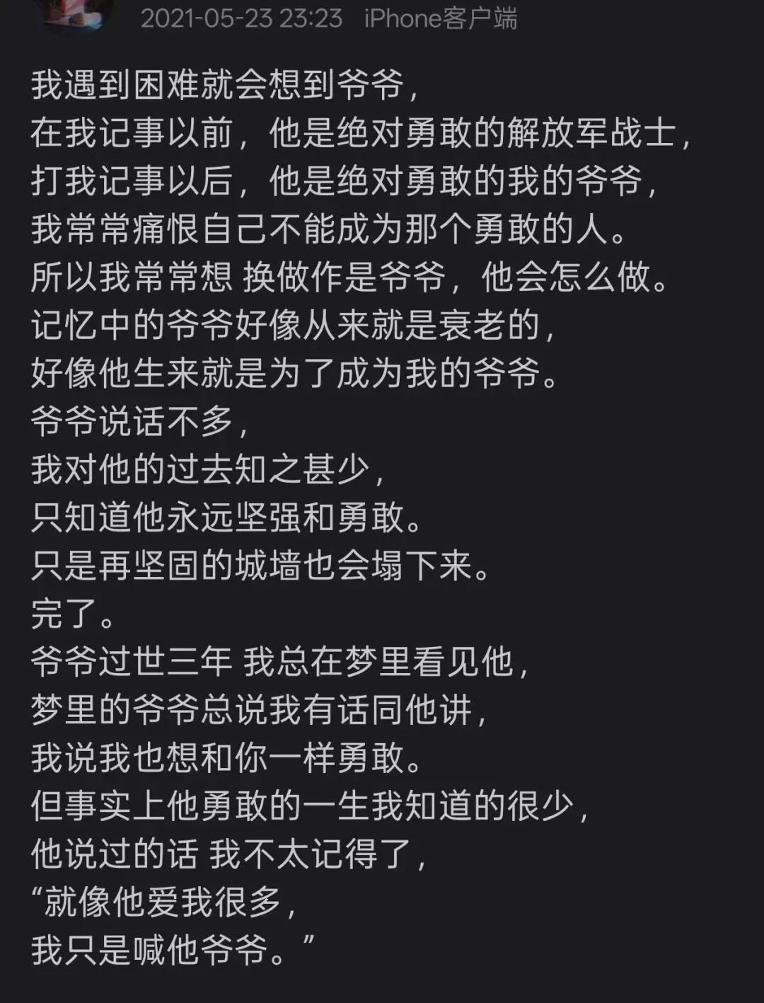 这话听来简单,像说“茶凉了”。可人过日子,少了个能在跟前站着、说话、喘气的人,心里就像塌了一块。我向来是个懦弱的人,爷爷走后,更是觉得路难走。在那之后我零零碎碎遇到了许多难处,我总在想:如果是爷爷,他会怎么做?因为他是那种天塌下来,也会先找根结实木头顶住的人。