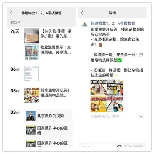 无论何时总能看到工程师傅们的身影穿梭在园区内,他们是家园的“隐形守护者”。从检修路灯到维护电梯,从排查消防设施到加固户外设施,每一处都凝聚着工程师傅的汗水。大风天气来临前,他们提前行动,巡查高空悬挂物、排查公共通道门窗是否闭合。他们用辛勤筑牢安全防线。