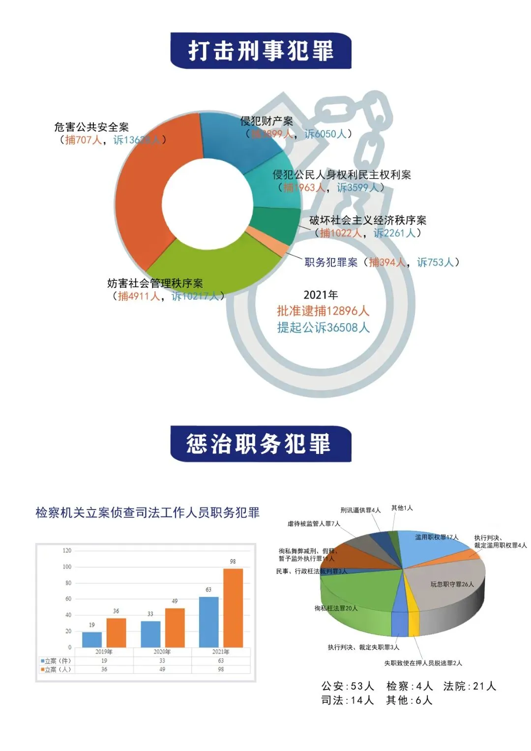 全面强化刑事检察。严厉打击严重侵害人身和财产权利、危害国家和公共安全刑事犯罪,批捕9769人、起诉30731人。推进扫黑除恶常治长效,起诉黑恶犯罪300人。积极参与命案积案攻坚行动,对6起重大命案依法报请核准追诉。协同推进反腐败斗争,起诉职务犯罪753人,依法对青海省检察院原检察长蒙永山受贿案提起公诉。“百名红通”人员白静贪污案,准确把握违法所得证明标准,入选全国检察机关指导性案例。开展“百日攻坚”行动,立案侦查司法工作人员滥用职权、徇私枉法等职务犯罪98人,同比上升100%。依法惩治破坏市场经济秩序犯罪,批捕1022人、起诉2261人。坚决纠正有案不立、压案不查、有罪不究问题,督促立案324件,监督撤案514件,纠正侦查活动违法2231件;秉持客观公正立场,对不构成犯罪、证据不足案件依法不批准逮捕2920人、不起诉2101人;针对判决畸轻畸重问题,提出刑事抗诉和再审检察建议439件。强化刑罚执行监督,针对“逍遥监外”“提钱出狱”问题,集中清理整治,监督收押收监586人,推动整改违规违法减假暂3544件。巡回检察6所监狱,严密防范“纸面服刑”。