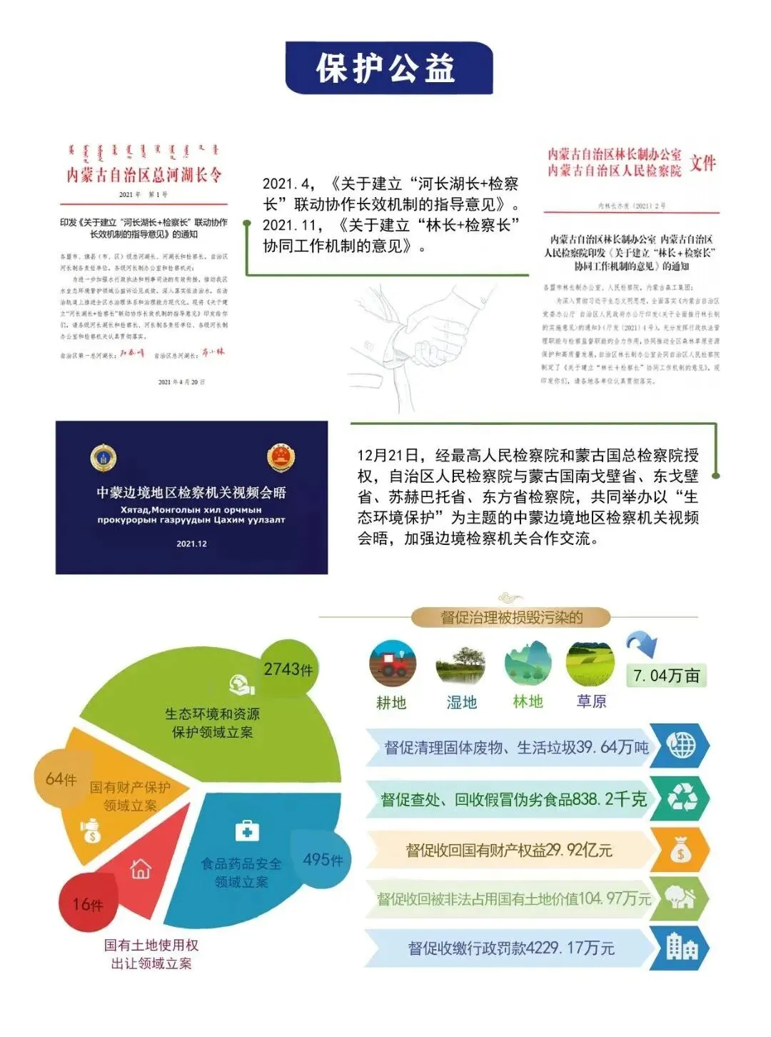 全力守护生态环境安全。起诉破坏环境资源犯罪2057人,办理生态环境资源公益诉讼2743件,补植复绿2.6万亩。联合自然资源、生态环境、水利等部门,做深做实“专业化监督+恢复性司法+社会化治理”模式,建立落实“林长、河湖长+检察长”联动协作机制,合力破解森林、河湖生态治理难题。持续深化生态保护跨区域协作,以生态环境保护为主题,成功举办中蒙边境地区检察机关视频会晤。深入推进守护北疆草原林地公益诉讼专项监督,审查起诉非法占用农用地犯罪1917人,督促恢复草原林地7万余亩。