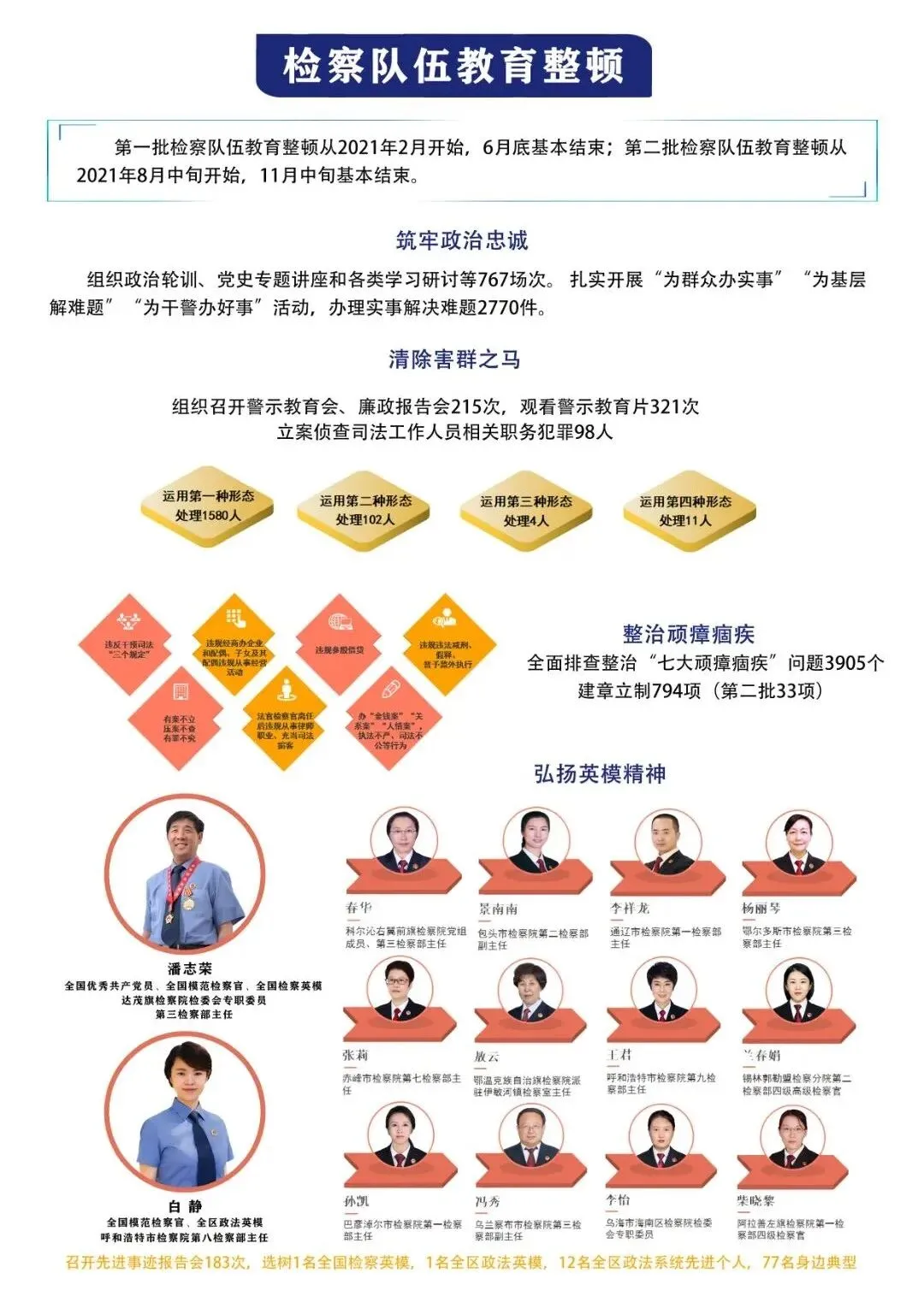 抓实教育整顿筑牢政治忠诚。把深入学习贯彻党的十九届六中全会精神融入党史学习教育和政法队伍教育整顿,深刻领会“两个确立”的决定性意义,一体推进政治教育、警示教育、英模教育,扎实推进以案促改、肃清流毒专项工作,全面筑牢“两个维护”思想根基和行动自觉。坚持刀刃向内,严肃执纪问责,运用第一种形态处理1580人,查处违纪违法117人。全面排查整治“七大顽瘴痼疾”,严格执行“三个规定”,逢问必录成为常态,干预过问插手检察办案得到有效遏制。聚焦共性问题,抓好建章立制,抓源治本制度体系不断完善。突出模范引领,选树1名全国检察英模、1名全区政法英模、12名全区政法系统先进个人、77名身边典型。扎实开展“为群众办实事”“为基层解难题”“为干警办好事”实践活动,办理实事解决难题2770件。