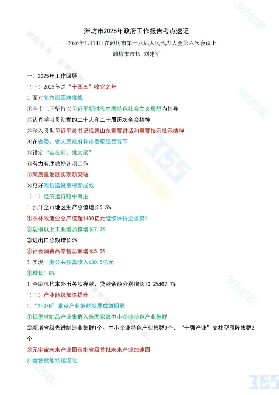 2026年潍坊市政府工作报告考点速记请到【2026年潍坊(市情)时政考点下载】下载,位置:365时政APP底部点击【课程】-资料下载板块