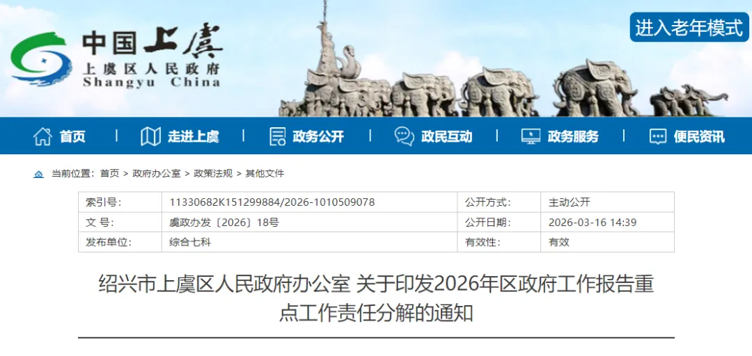 近期,官方发布了绍兴市上虞区人民政府办公室 关于印发2026年区政府工作报告重点工作责任分解的通知,让我们一起来看看这份通知,是对工作报告的工作分解。各乡镇人民政府、街道办事处,区直各部门和单位: