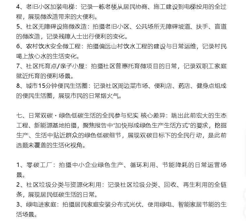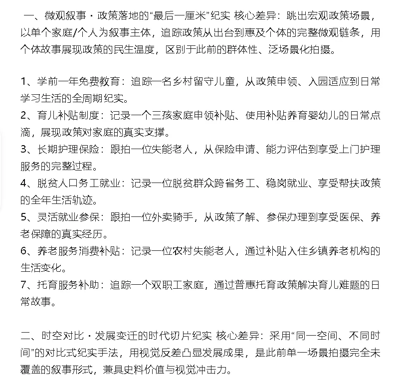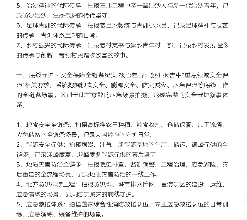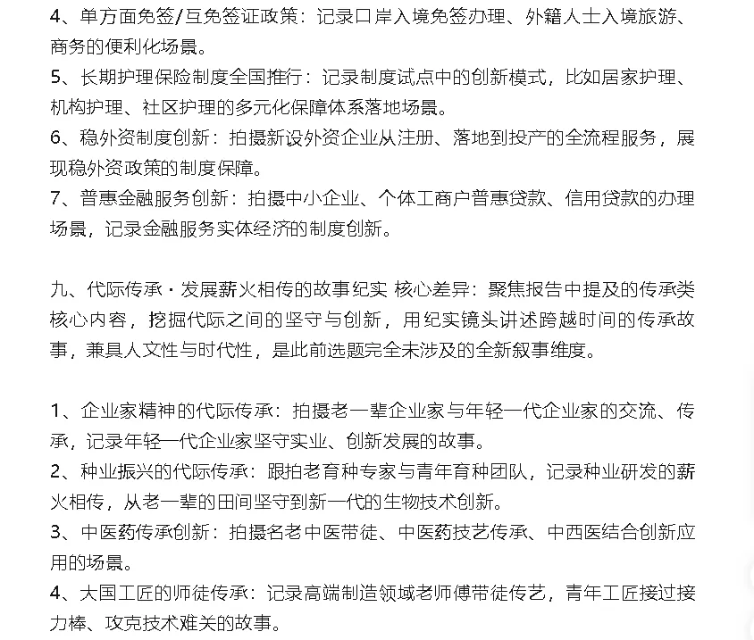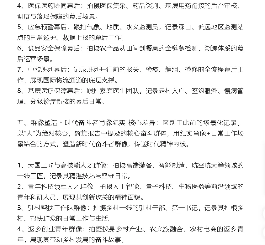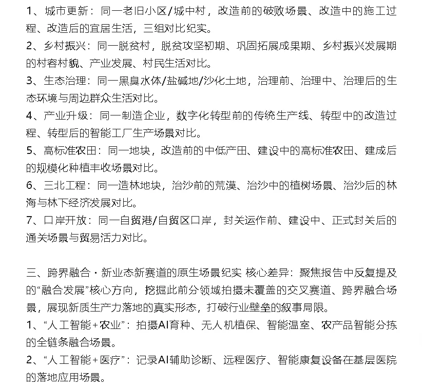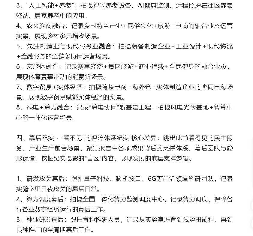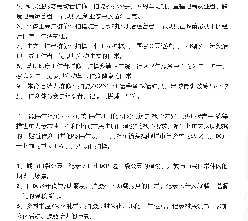 本次选题方向跳出此前按行业领域划分的单一场景记录模式,从叙事视角、内容切口、价值维度三大层面做核心创新,聚焦报告中未深度挖掘的细节、链条、人物与故事,兼顾纪实摄影的真实性、人文性、故事性与时代性,与此前选题无重复,共分为十大全新方向,全部严格锚定报告原文内容。