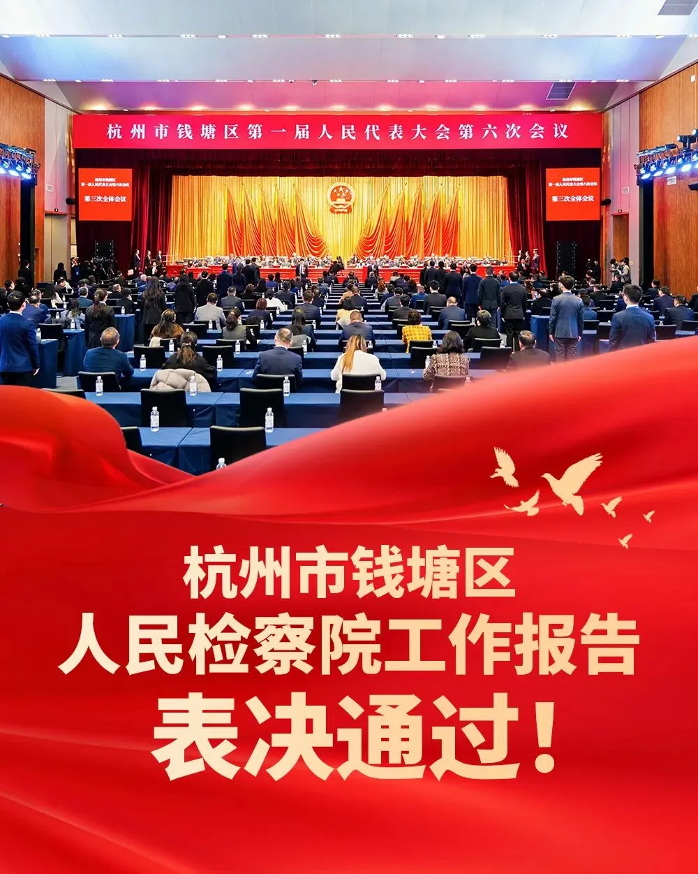 2月6日,杭州市钱塘区第一届人民代表大会第六次会议表决通过了杭州市钱塘区人民检察院工作报告。2026年,钱塘区人民检察院将坚持以习近平新时代中国特色社会主义思想为指导,全面贯彻落实党的二十大和二十届历次全会精神,学深悟透习近平法治思想,深入落实《中共中央关于加强新时代检察机关法律监督工作的意见》,深入学习贯彻习近平总书记考察浙江重要讲话精神特别是“4+1”重要要求,全面落实省委“132”总体工作部署和市委建设世界一流的社会主义现代化国际大都市工作要求,紧紧围绕区委“147”工作体系,聚焦法律监督主责主业,以刚强意志惩治犯罪、维护稳定,以专业水准高质效办好每一个案件,以智慧担当修复秩序、推进治理,护航高水平安全和高质量发展良性互动,为加快建设全球先进制造业基地主平台,全力打造大都市战略门户、现代化一流新区贡献澎湃法治力量。