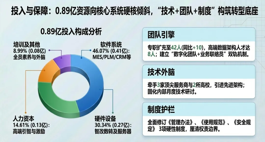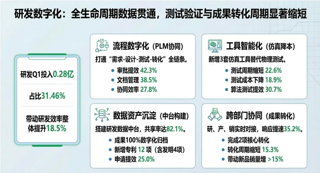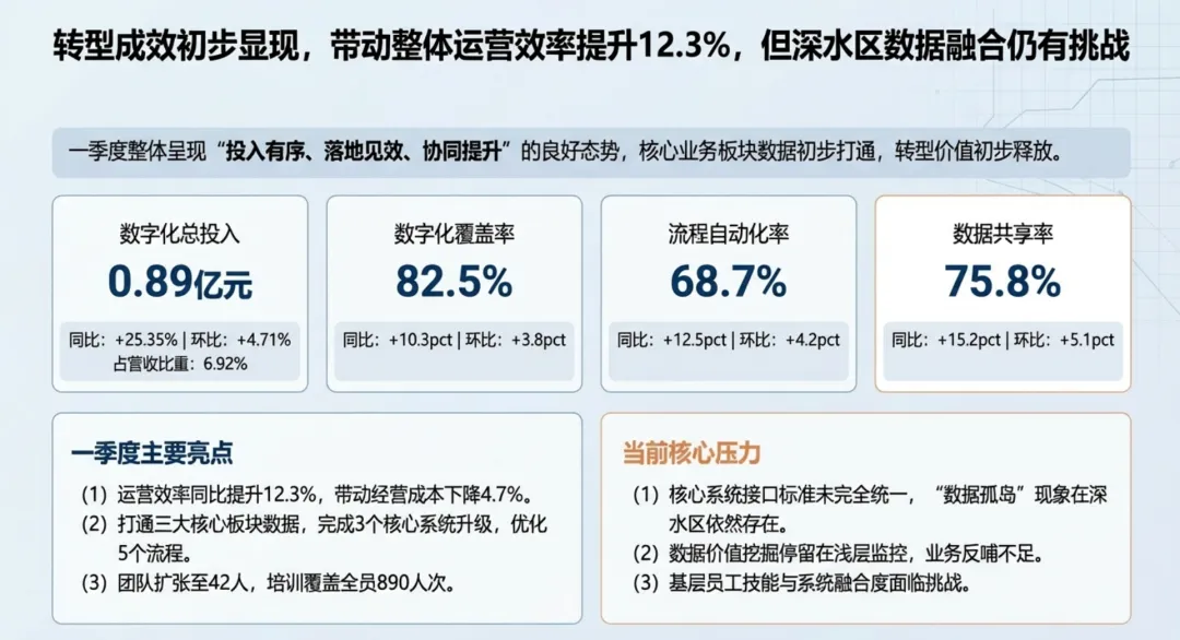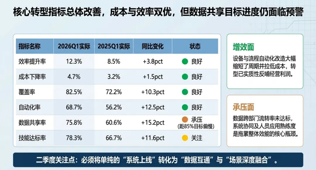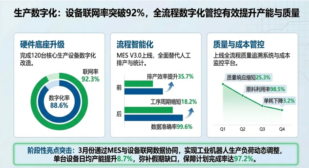 生产部分:实现了120个关键设备的数字化,数字化率达到88.6%;MES系统的升级提高了35.7%的排产效率,减少了12.8%的质量问题。