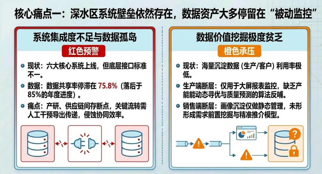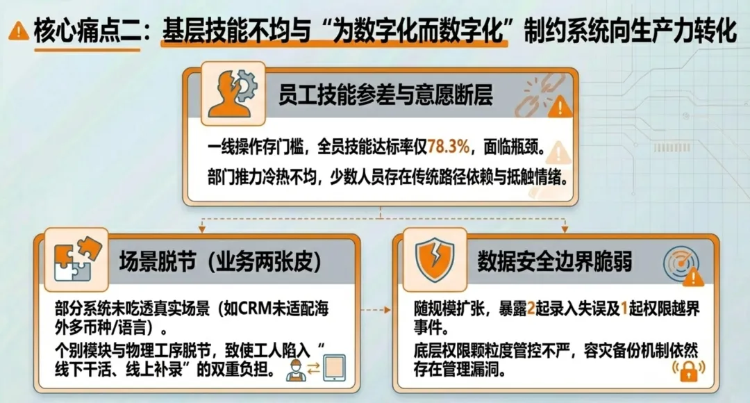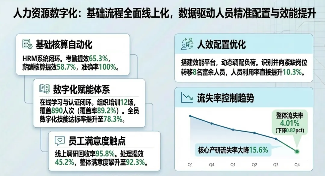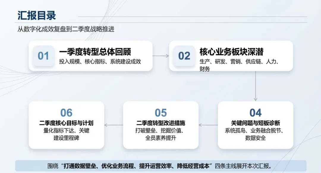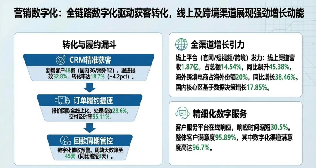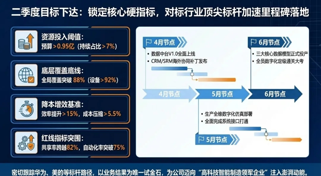 生产部分:实现了120个关键设备的数字化,数字化率达到88.6%;MES系统的升级提高了35.7%的排产效率,减少了12.8%的质量问题。