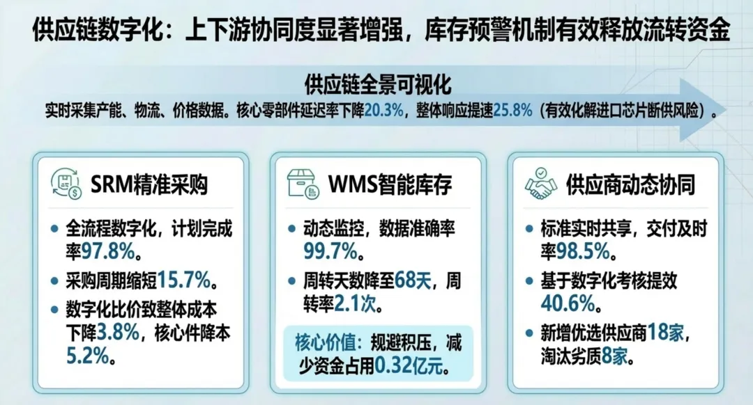 供应链方面:SRM系统和WMS系统的投入使用,使企业的采购周期下降了15.7%,存货周转率下降到了68天,降低了0.32亿元的资金占用。