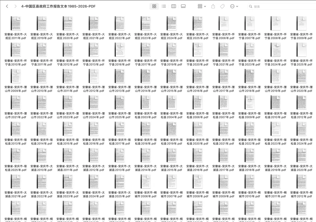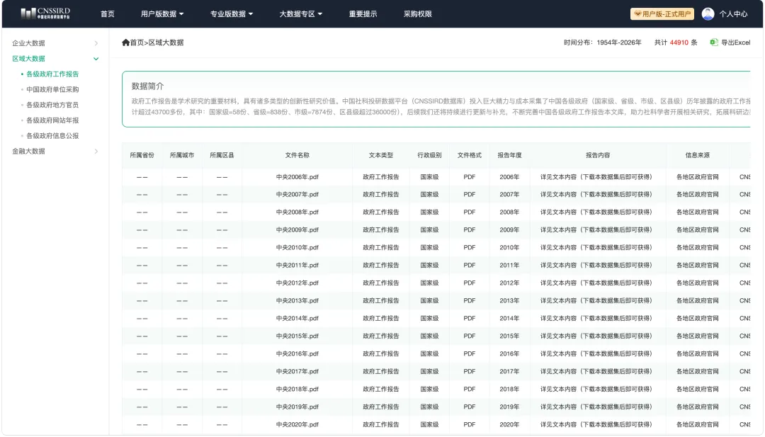 政府工作报告文本是社科领域学者开展学术研究的重要材料,具有诸多类型的创新性研究价值。为此,中国社科投研数据平台(CNSSIRD数据库)投入巨大精力与成本采集了中国各级政府(国家级、省级、市级、区县级)历年披露的政府工作报告原始文本。截止目前,我们已经获得超过44910多份原始文本(其中:国家级=58份、省级=838份、市级=7875份、区县级超过36000份)。属于目前最为完善的政府工作报告文本库。后续我们还将不断进行补充,持续完善中国各级政府工作报告本文库,助力社科学者拓展科研边界与学术创新。[1]李小荣,徐腾冲. 政府工作报告环保关注的效用:基于企业ESG视角[J].中央财经大学学报,2026,(03):35-48.