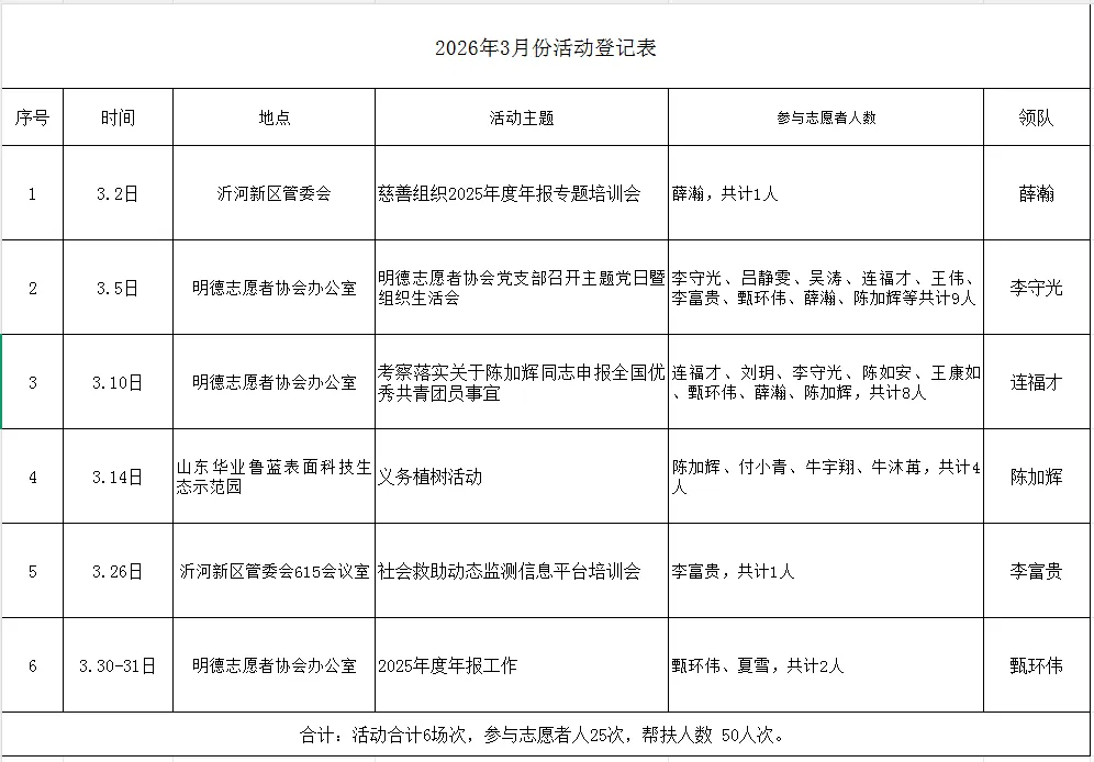 2026年,本协会认真学习落实《中华人民共和国慈善法》的基本要求,以实际行动践行“奉献、友爱、互助、进步”的志愿者精神。严格依据协会章程开展各类活动,将弘扬沂蒙精神作为发展理念,以传播文明,服务社会为发展宗旨,全力配合各级有关部门开展志愿服务工作,充分发挥志愿服务在社会治理中的积极作用。现将2026年3月份的志愿服务活动以及捐赠明细作如下公示: