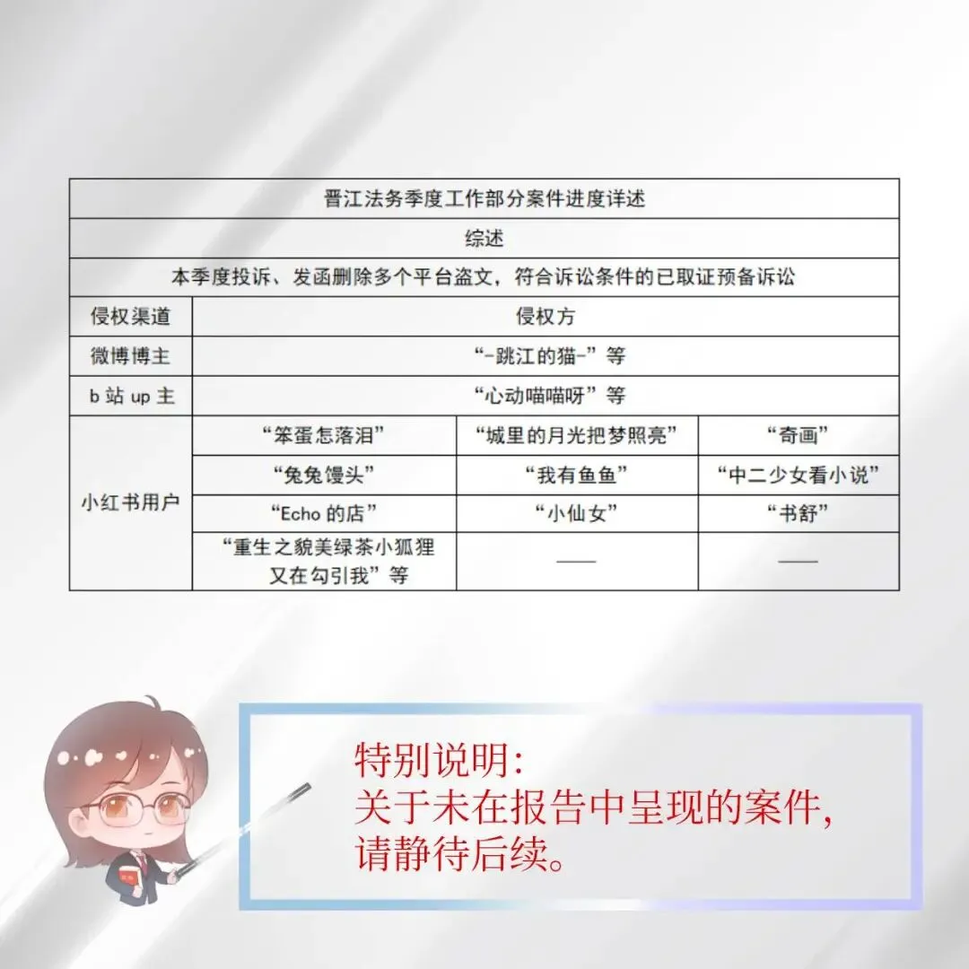更多关于已完结的案件情况,请在晋江官方微博@晋江文学城 主页内搜索🔎 晋江法务/晋江法务在行动 等关键词查看。