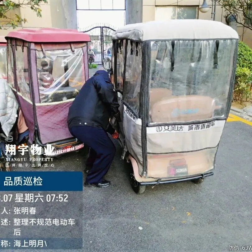 日常巡逻过程中,实时检查小区监控、公共设施完好情况,及时发现并制止违规占道、噪音扰民、破坏公共设施等行为;定期清理楼道堆物、规范非机动车乱停乱放,
